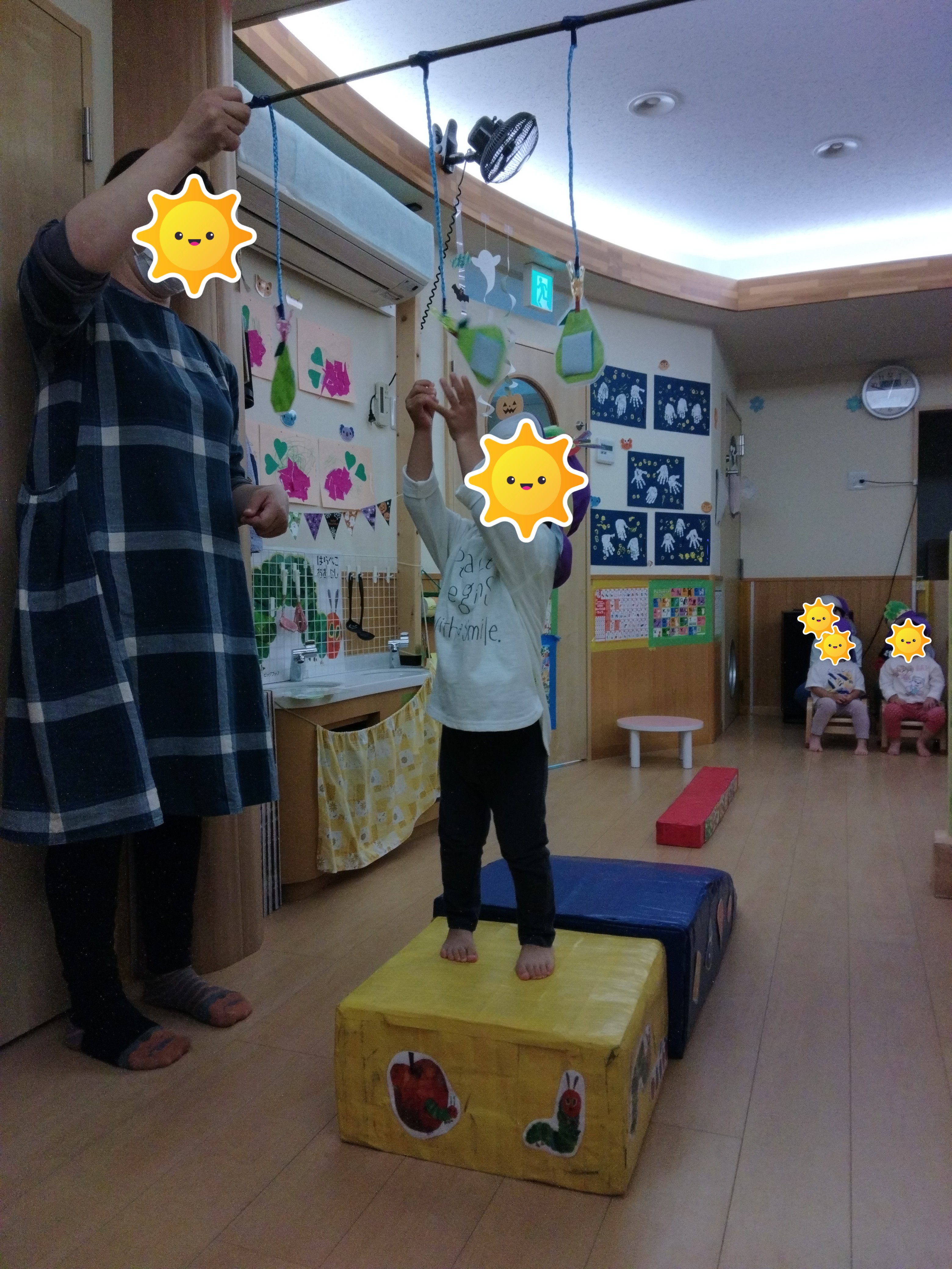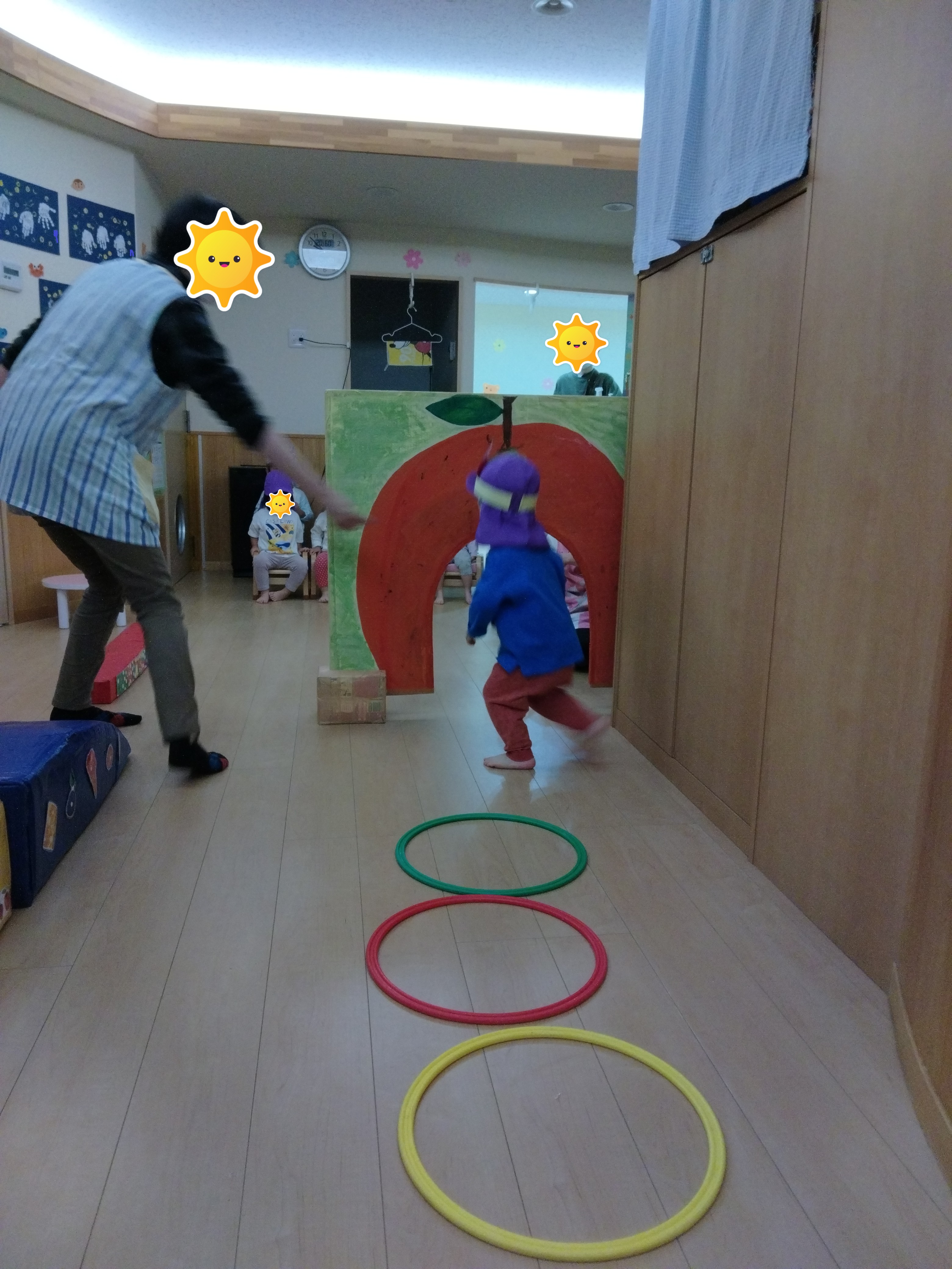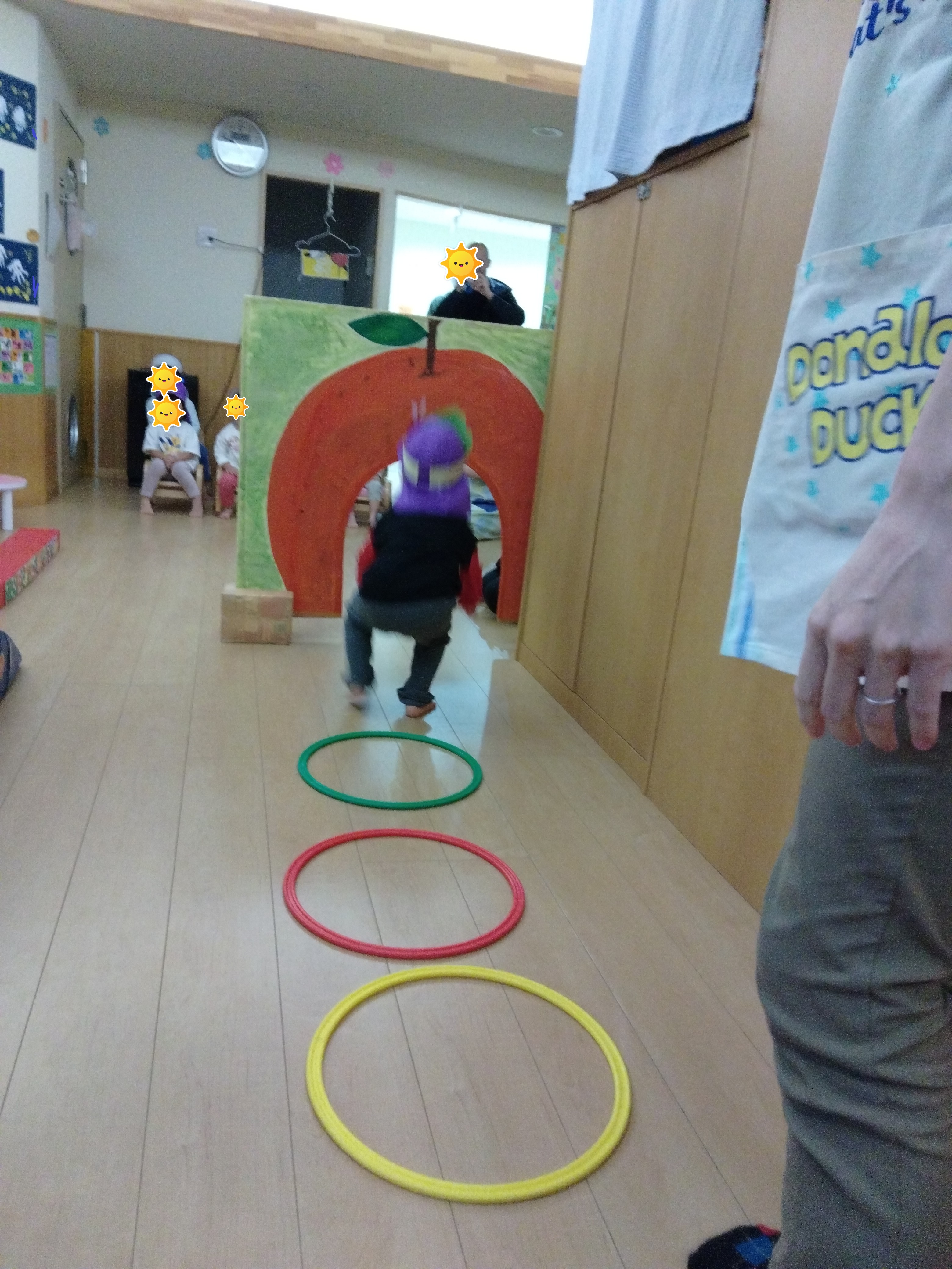 外で行うことができればここで親子でかけっこでしたが、さすがにそれは今回はおあずけです。今年ははらぺこあおむしをテーマに、子どもたちは一本橋を渡ったり、台に登ったり、ミカンのトンネルを潜り抜けたり大活躍です。