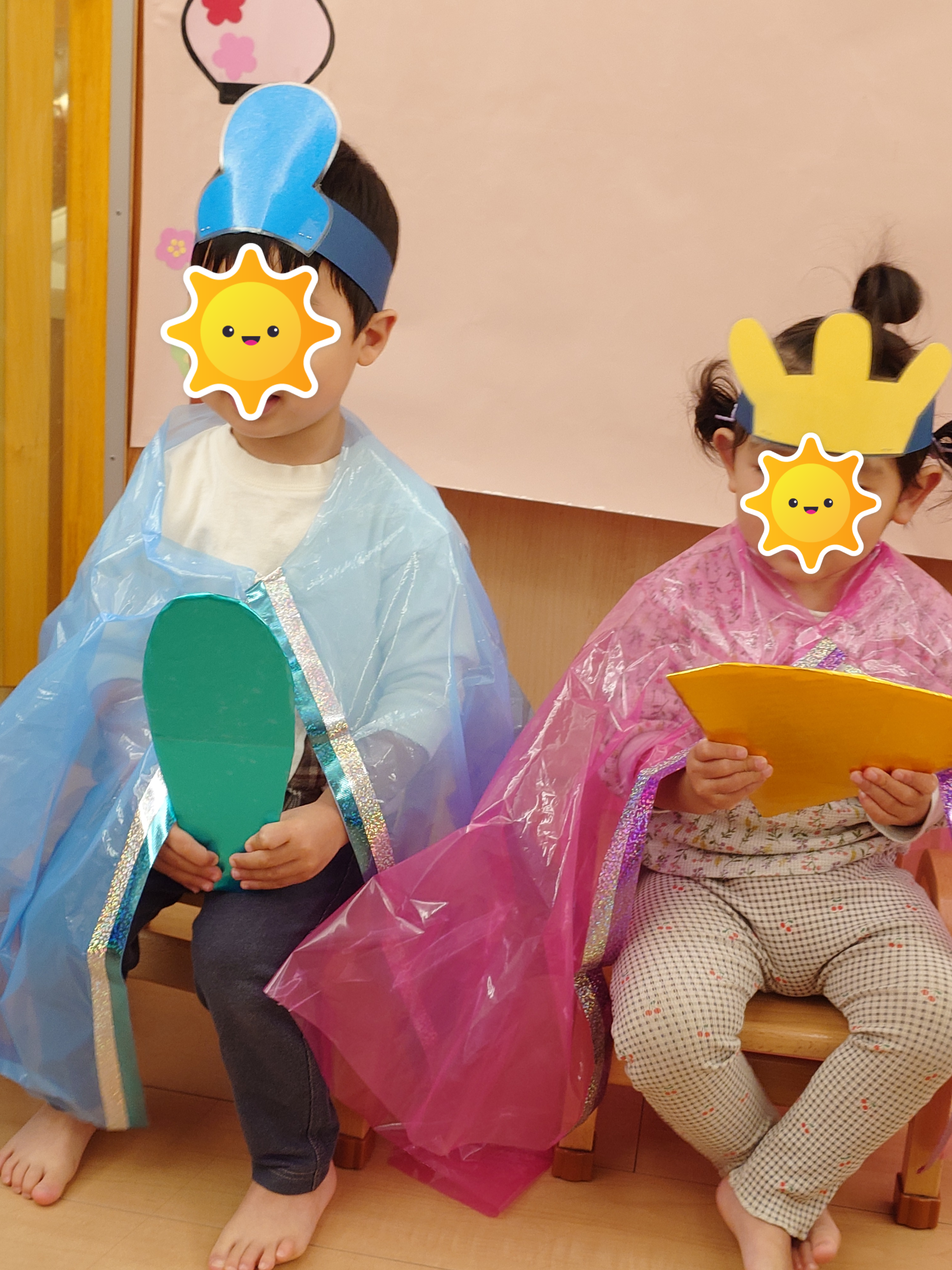 子どもたちにお内裏様とお雛様に変身してもらい記念撮影しました。