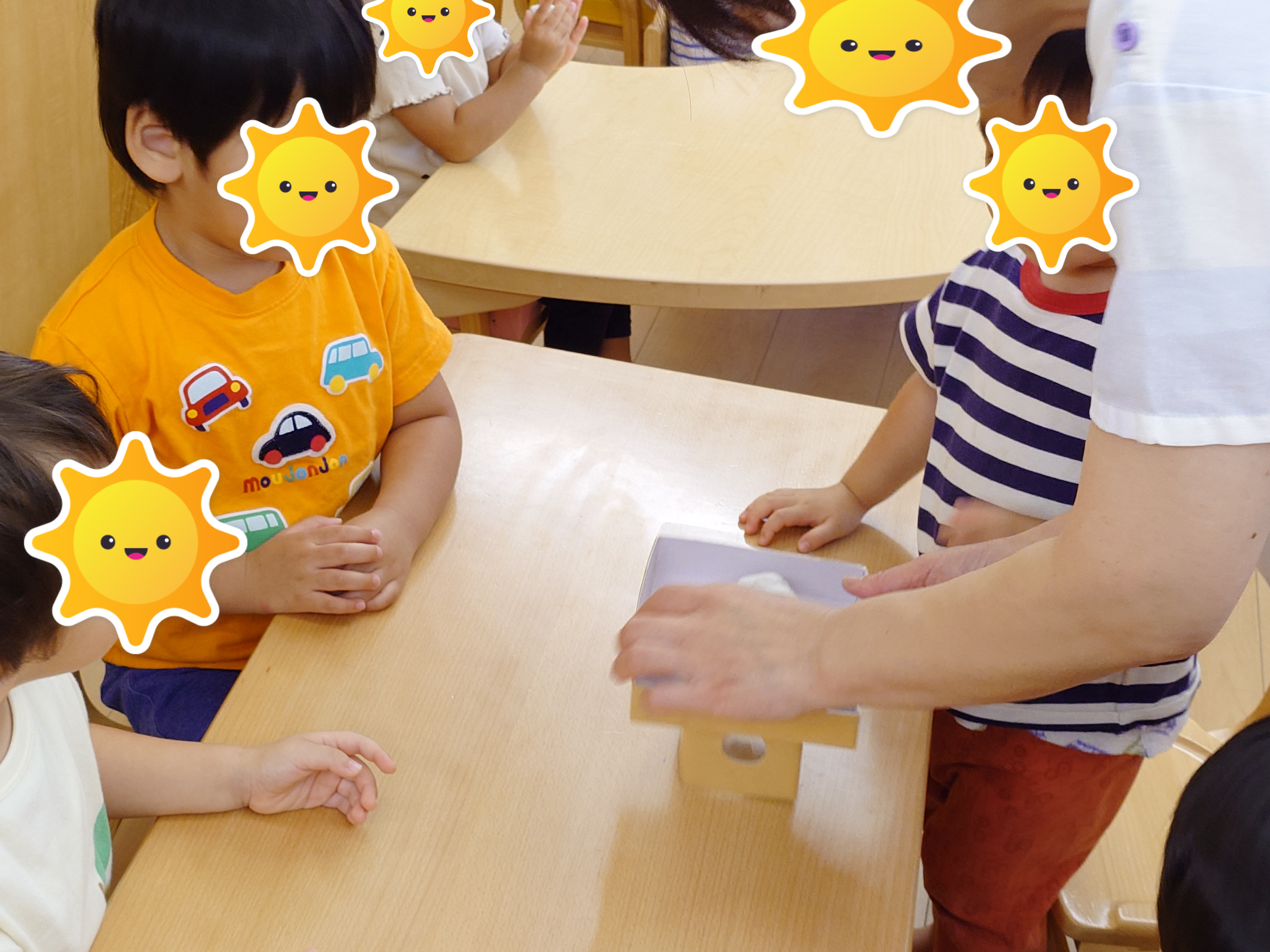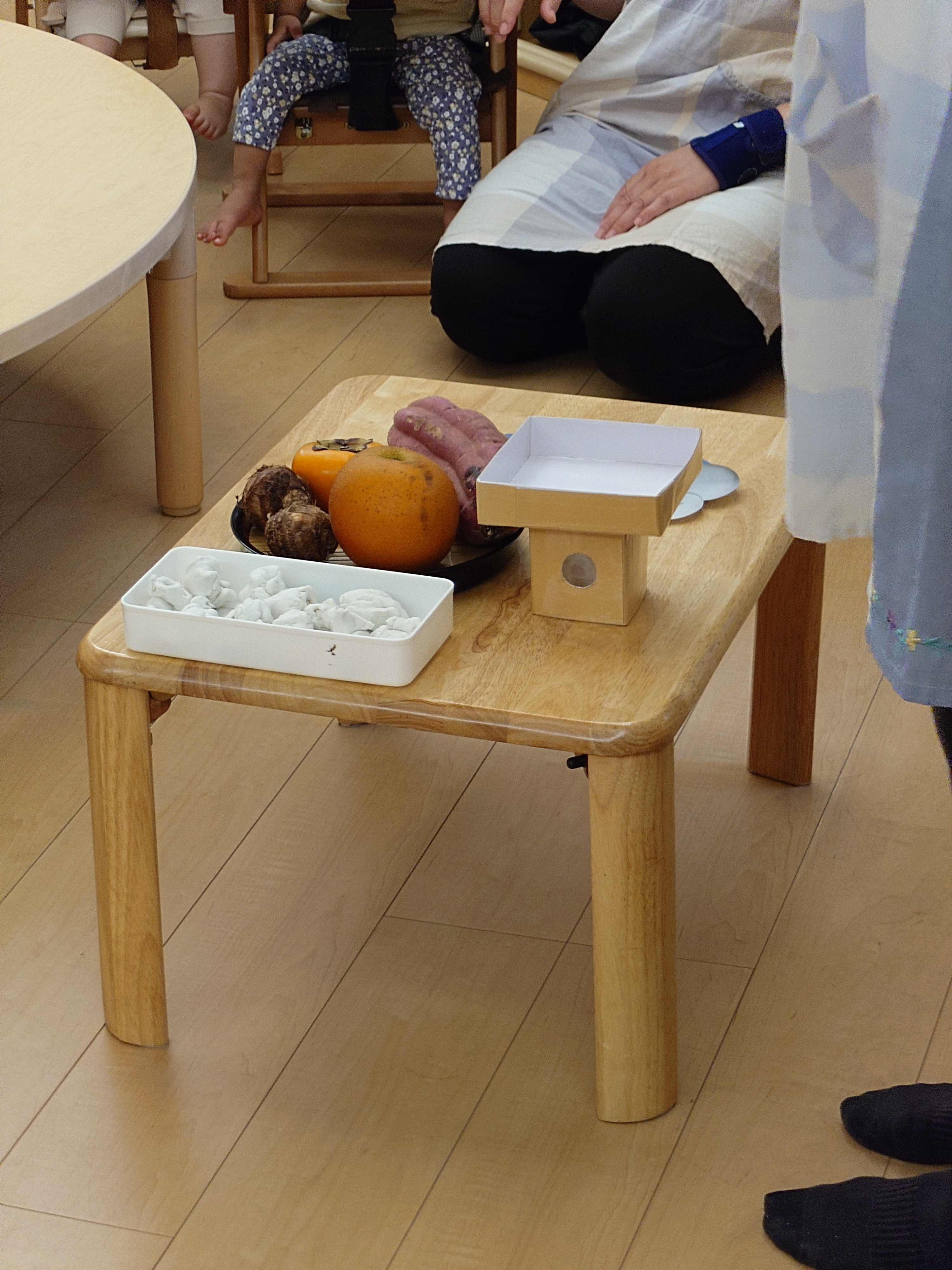 ススキに秋の食べ物を用意しました。子どもたちはよくわかっていてサトイモ以外はみんな名前を言い当てていました。食育活動の賜物ですね。