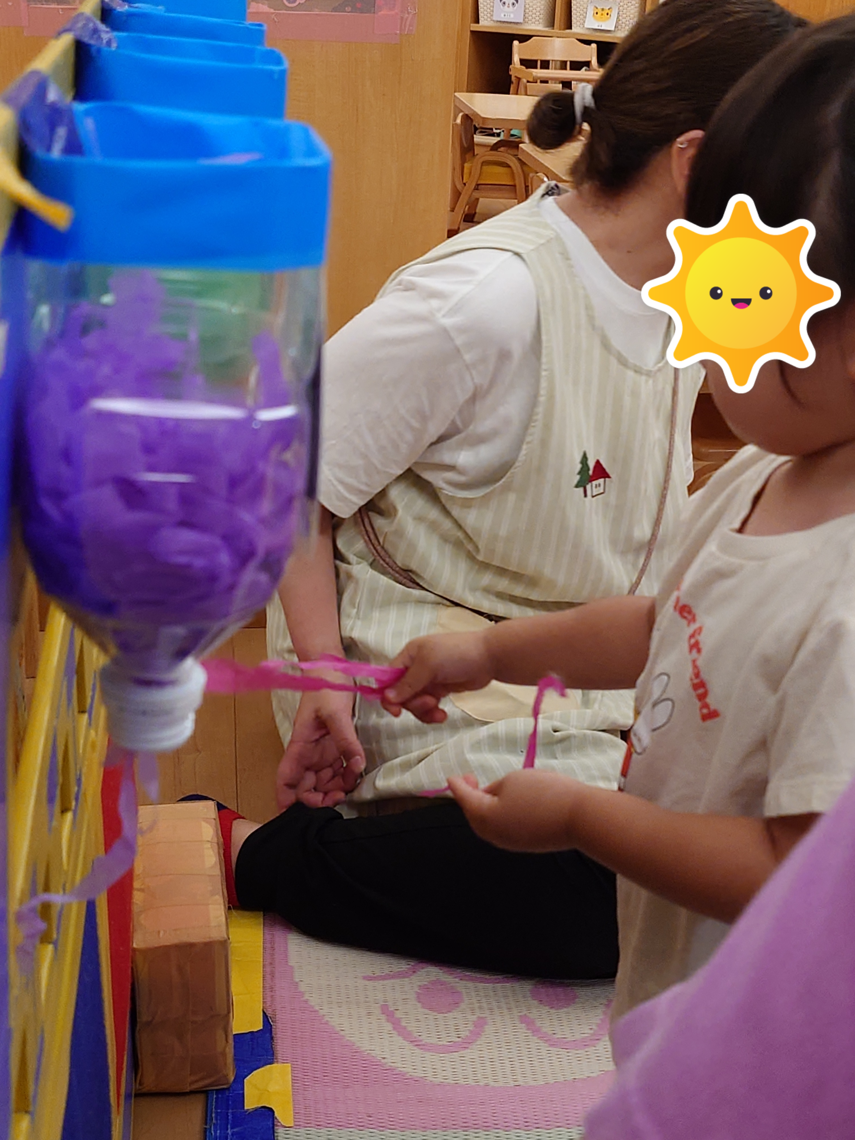 シロップはお花紙をちぎってペットボトルにセットしています。