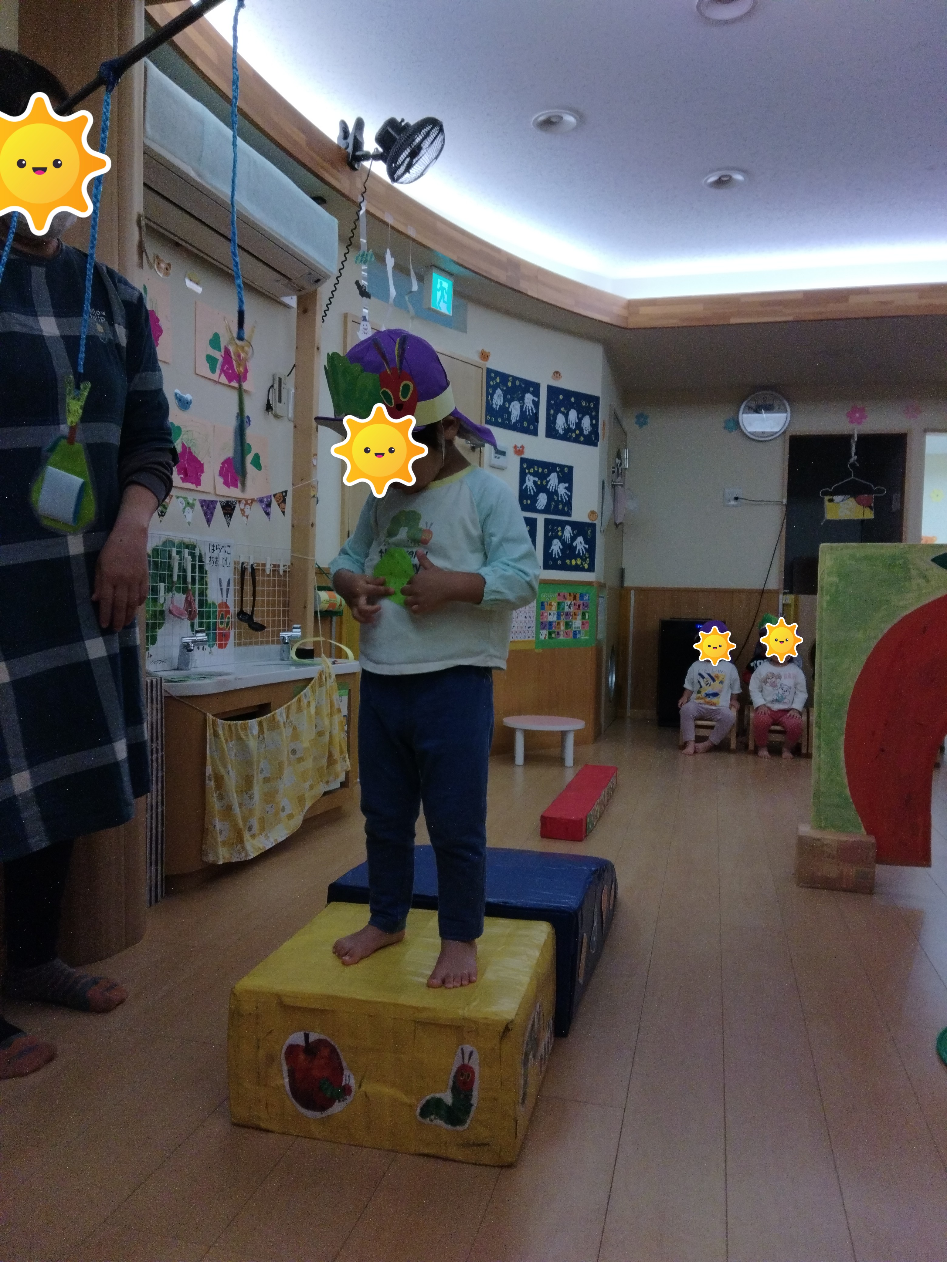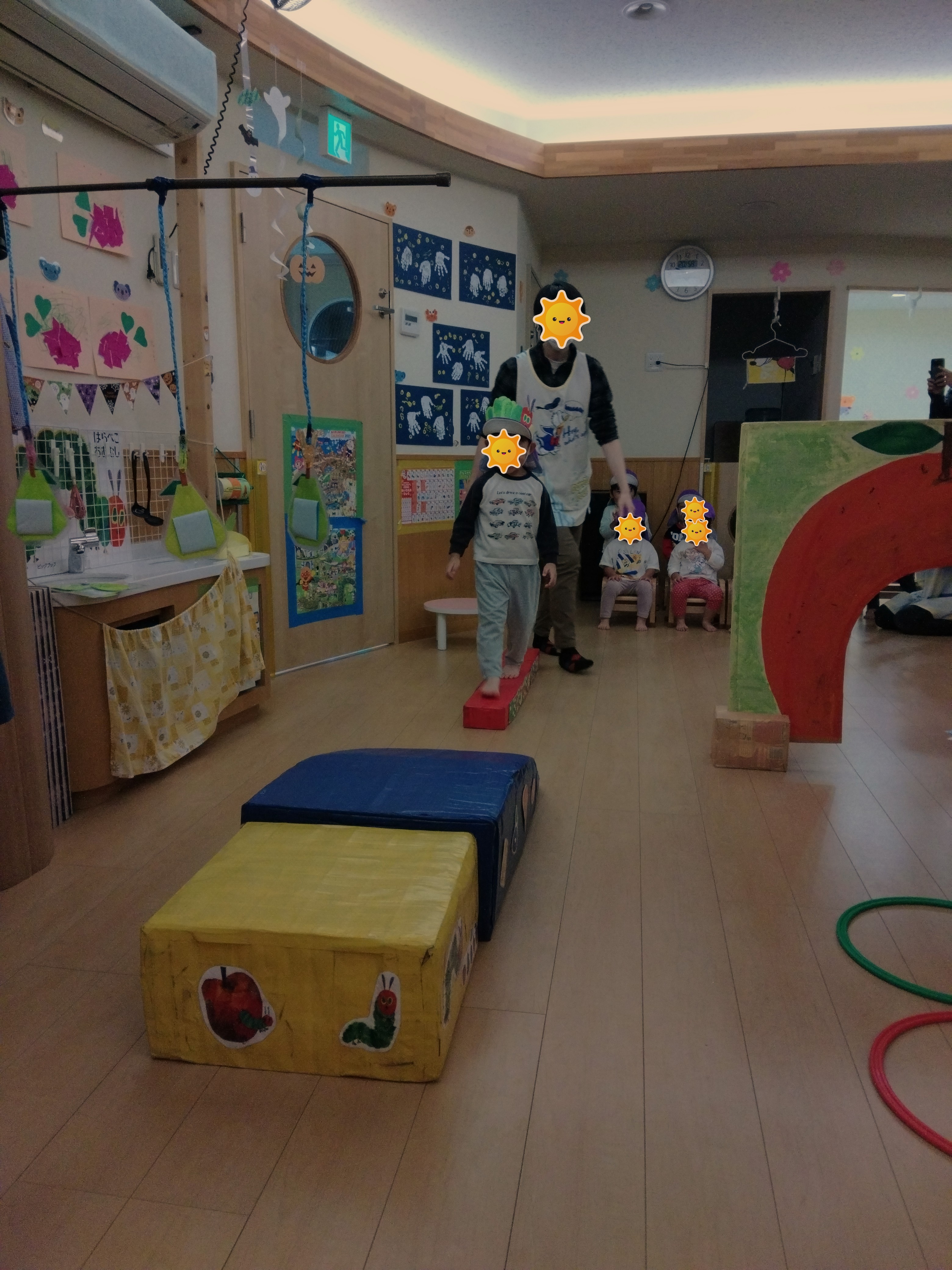 外で行うことができればここで親子でかけっこでしたが、さすがにそれは今回はおあずけです。今年ははらぺこあおむしをテーマに、子どもたちは一本橋を渡ったり、台に登ったり、ミカンのトンネルを潜り抜けたり大活躍です。