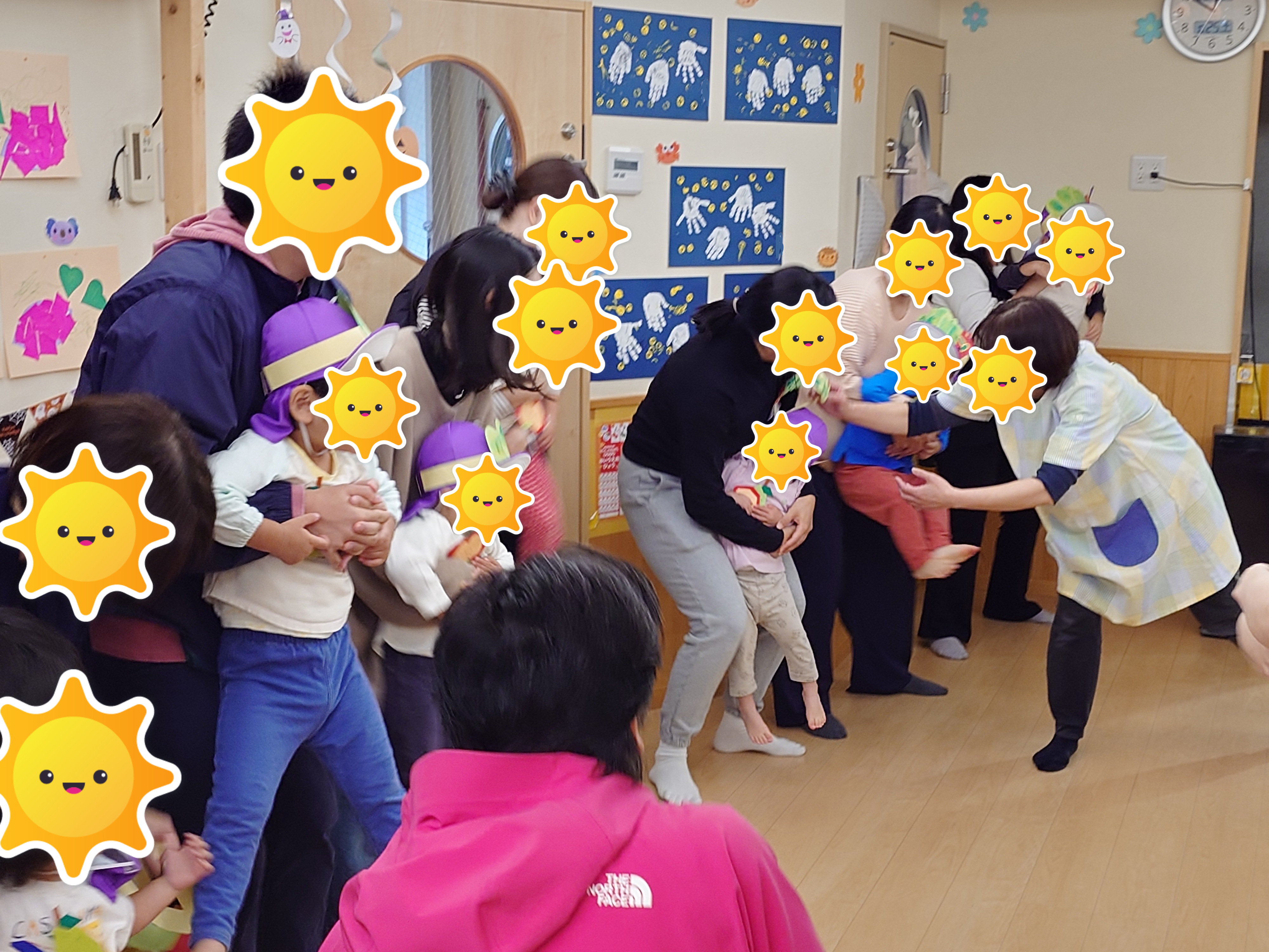 2つダンスを踊った後は、親子一緒にパンダ体操です。おしりをくっつけたり、抱っこしたり、親子ともどもとても楽しそうです。